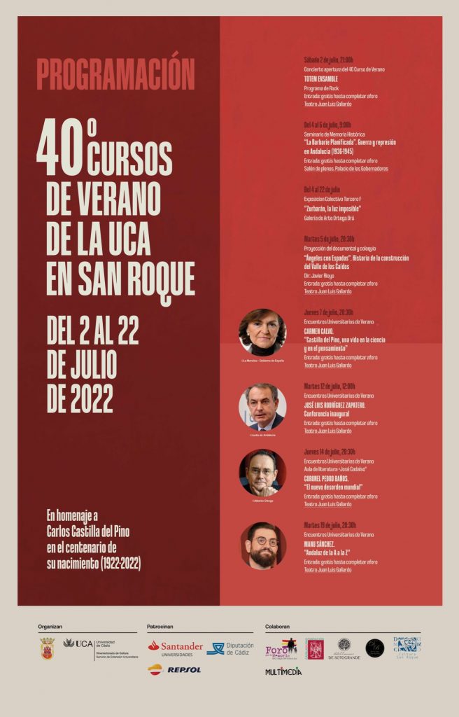 La 40º edición de los Cursos de Verano de la UCA en San Roque cuenta con el patrocinio de Santander Universidades, Repsol y la Diputación de Cádiz, así como la colaboración del Foro por la Memoria Histórica, la empresa Multimedia y el Hotel El Encinar.